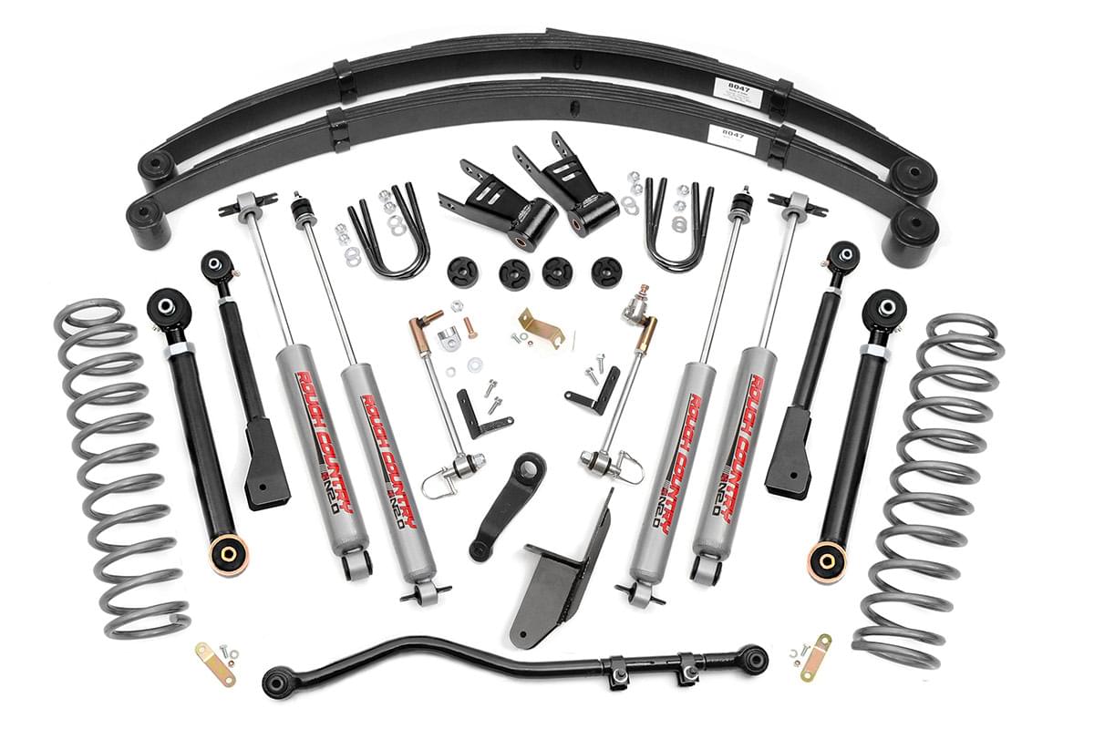 The 6.5-inch X-Series N2 features a transfer case drop kit: adjustable track bar: brake line brackets: sway-bar disconnects and a drop pitman arm: promoting optimum angles for suspension components after lifting . A set of lifted coil springs: rear lifted leaf springs and rear lift shackles help your XJ gain a total of 6.5-inches of lift - plenty of clearance for 33-inch tires and up to 35-inch tires with minor fender trimming. This X-Series kit features Rough Countrys X-Flex Control arms in the front upper and lower position. X-Flex Arms are fully adjustable: and feature a ball-in joint: massive 2.5-inch diameter body: and huge 1.25-inch threads. X-Flex Control Arm Joints have long offered considerable range: strength: and safety for off-road applications ? but it doesnt stop there. X-Flex Joints now feature Adjustable Retainer Rings: allowing you to preload the bushings by compressing them prior to install. These bushings are fitted with interlocking grooves that completely encase the ball joint for a firm grip. Made of high-quality 88 Durometer Urethane: these bushings retain the memory of their original shape: are weather resistant: and offer a much longer lifespan. This X-Series Lift now also offers N2.0 shocks; outfitted with rubber bushings and armed with 10-stage velocity sensitive valving: chromed hardened 9/16-inch piston rods: and massive 1 and 3/8-inch bores; allowing for a super smooth highway ride and outstanding control in rugged off-road situations - all from the same shock. So if youre looking for longevity and an uncompromised ride: look no further. Rough Countrys X-Series N2 features the best of the best in off-road hardware.