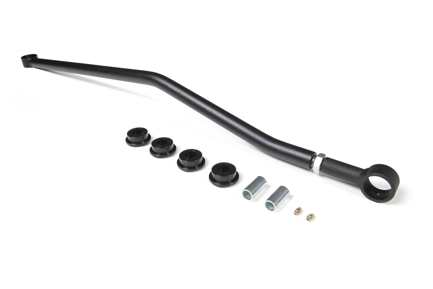 This heavy-duty adjustable track bar mimics the shape of the factory track bar. The bar mounts in the factory locations or works with any aftermarket relocation bracket that was designed for use with the stock track bar.