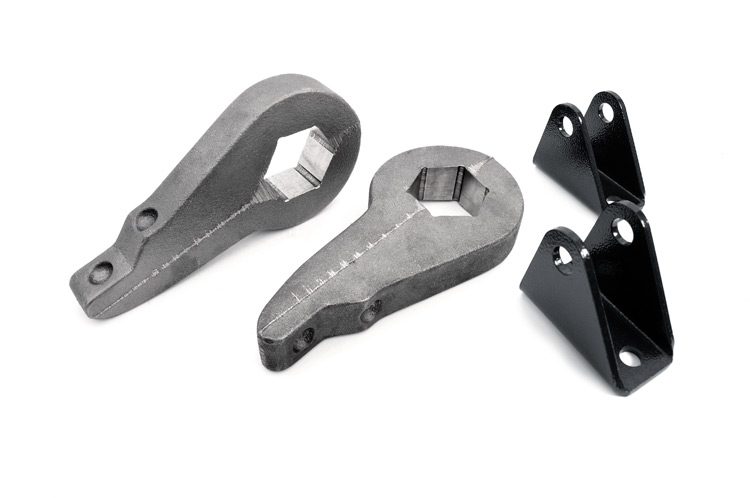 Leveling torsion bar adjuster keys and front shock extension brackets