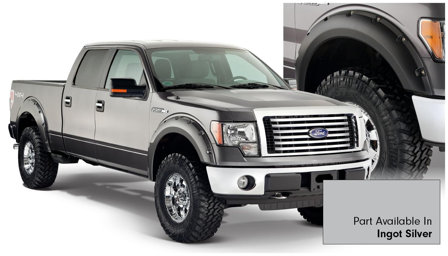 Set of 4 Ford Pocket Style Fender Flares for the 09-14 F-150 Styleside 67.0 in bed, 78.8 in bed, 97.4 in bed, Does not fit Raptor models, Door molding removal on bed and front fender required for fitment on Platinum model.
