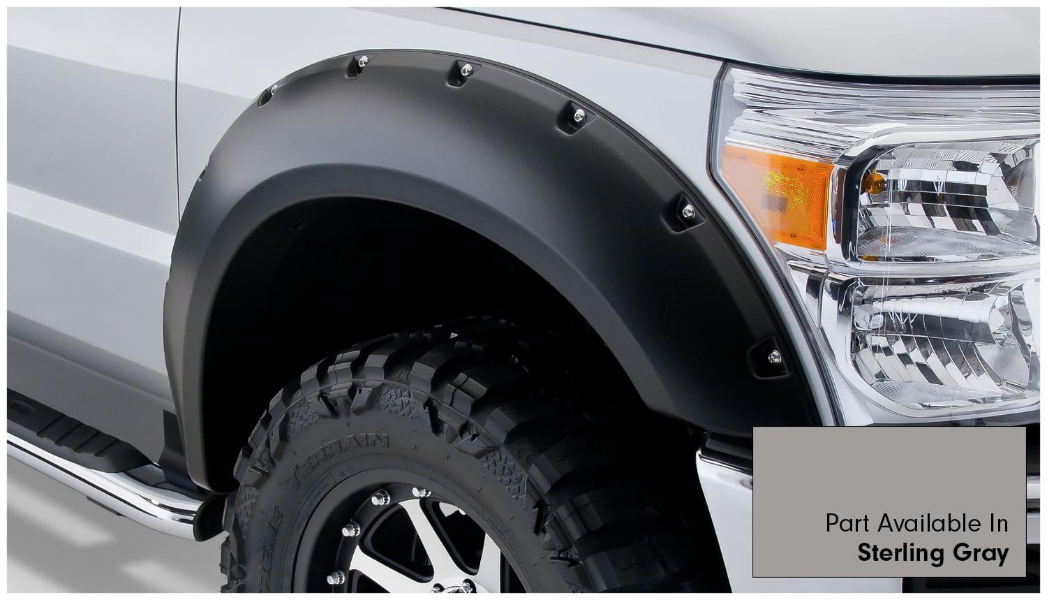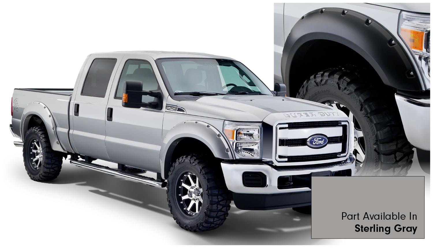 Set of 4 Ford Pocket Style Fender Flares for the 11-16 F-250 Super Duty Styleside 81.8 in bed, 98.0 in bed, 11-16 F-350 Super Duty Styleside 81.8 in bed, 98.0 in bed. Note: Does not fit dually models.