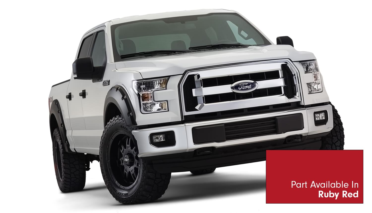 Set of 4 Ford Pocket Style Fender Flares for the 15-16 F-150 Styleside 67.1 in bed, 78.9 in bed, 97.6 in bed. Note: Not compatible with models installed with Technology Package 68T including lane-keeping sensors on the front fender.