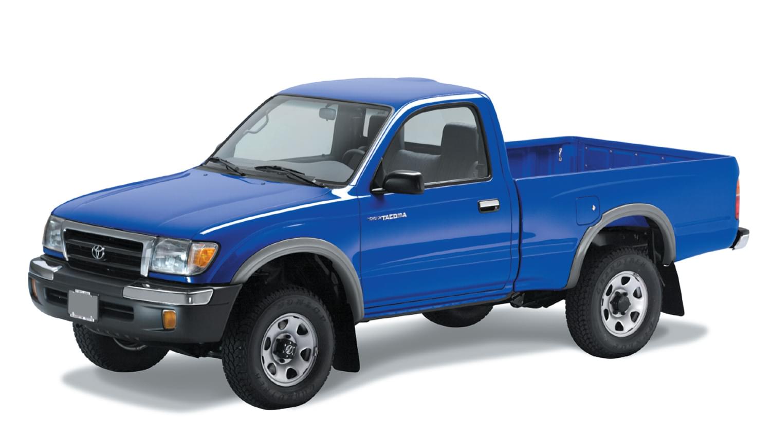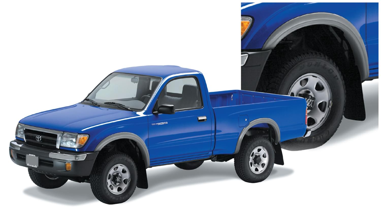 Set of 4 Toyota Street Flares Fender Flares for the 95-00 Tacoma 4WD, Fleetside 74.5 in bed, 01-04 Tacoma Fleetside 61.5 in bed, 74.5 in bed. Note: Does Not Cover Factory Flare Holes, Does Not Fit Flareside Models.