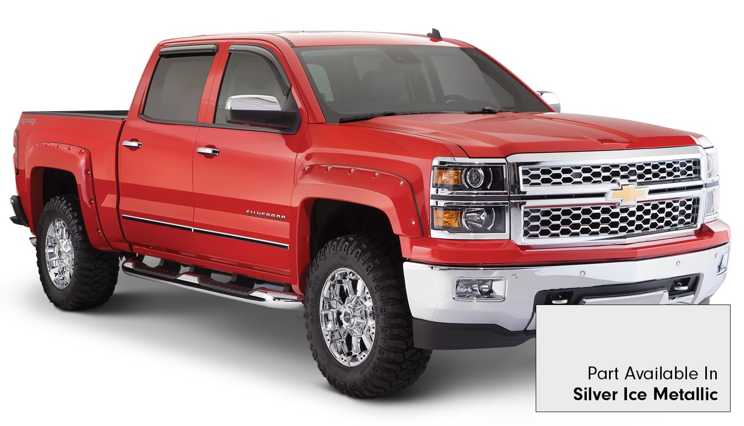 Set of 4 Chevrolet Pocket Style Fender Flares for the 14-15 Chevrolet Silverado 1500 and 15-16 Chevrolet Silverado 2500/3500 HD Fleetside 78.8 in bed and 97.8 in bed. Note: Does not fit dually models.