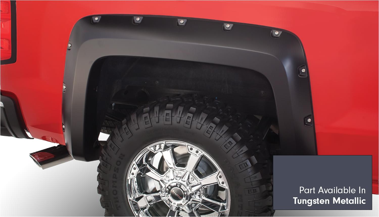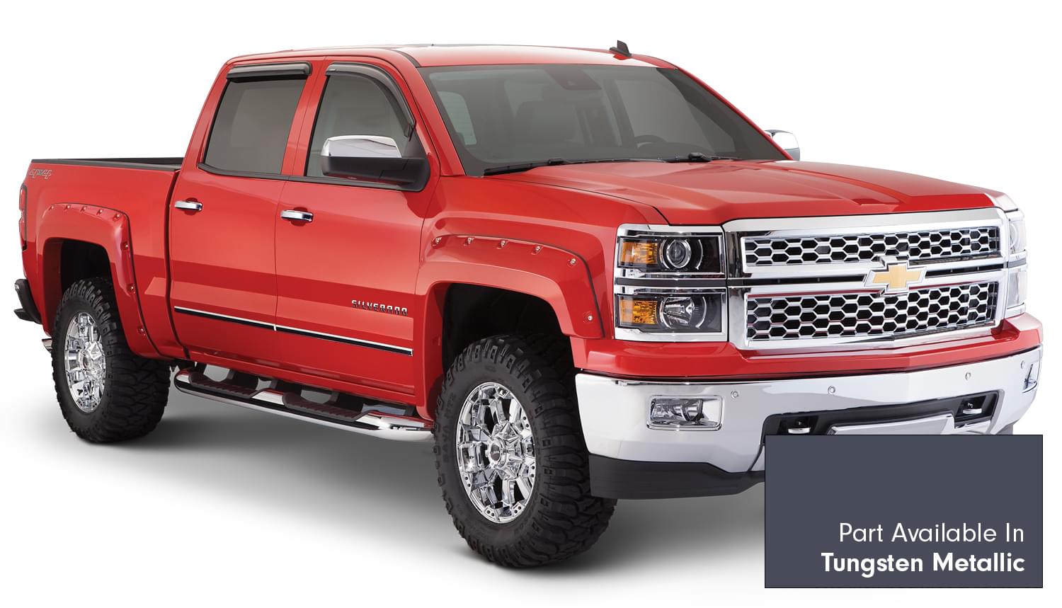 Set of 4 Chevrolet Pocket Style Fender Flares for the 14-15 Chevrolet Silverado 1500 and 15-16 Chevrolet Silverado 2500/3500 HD Fleetside 78.8 in bed and 97.8 in bed. Note: Does not fit dually models.
