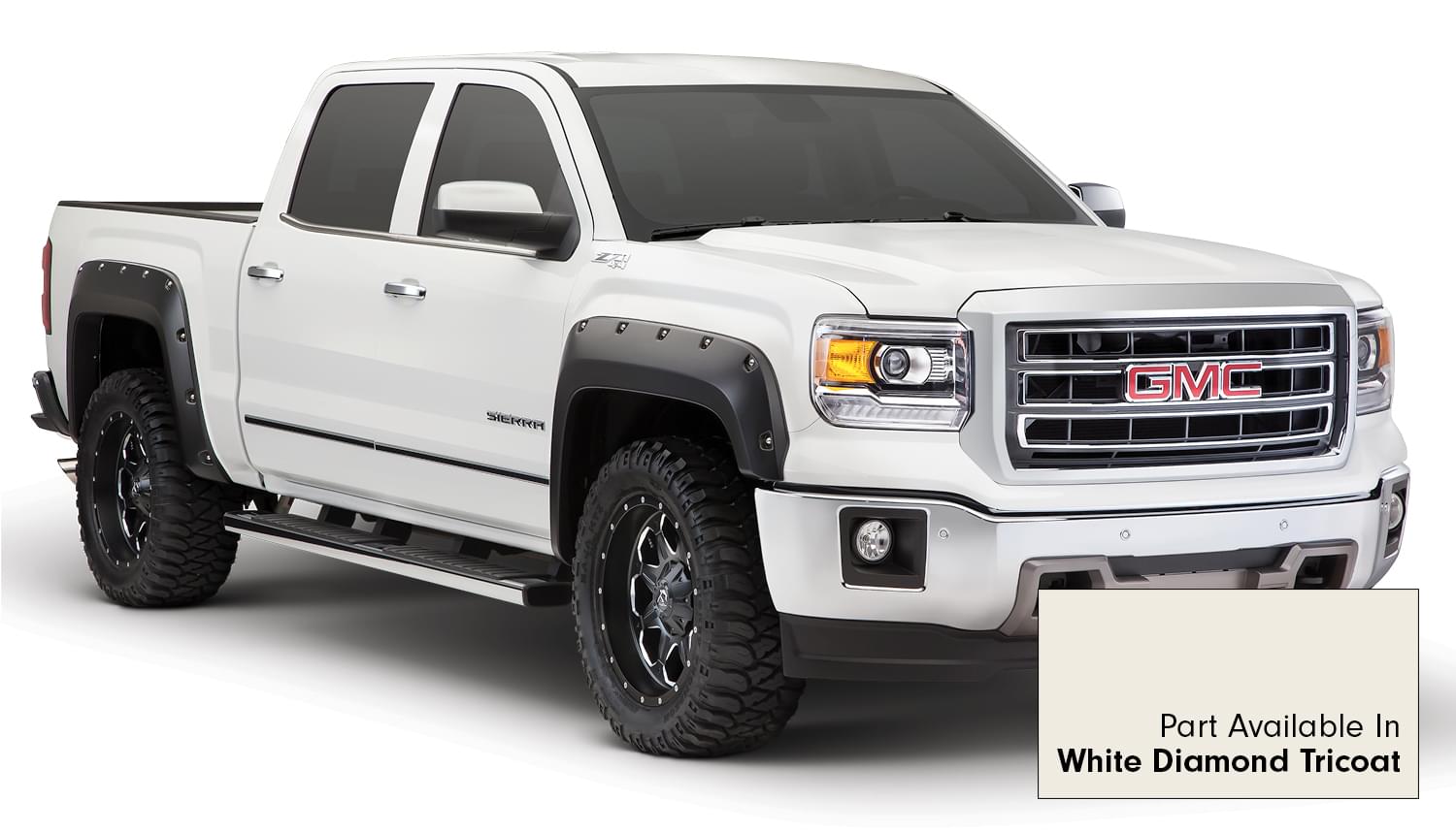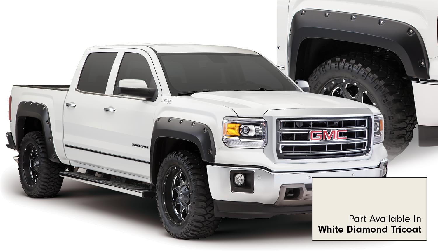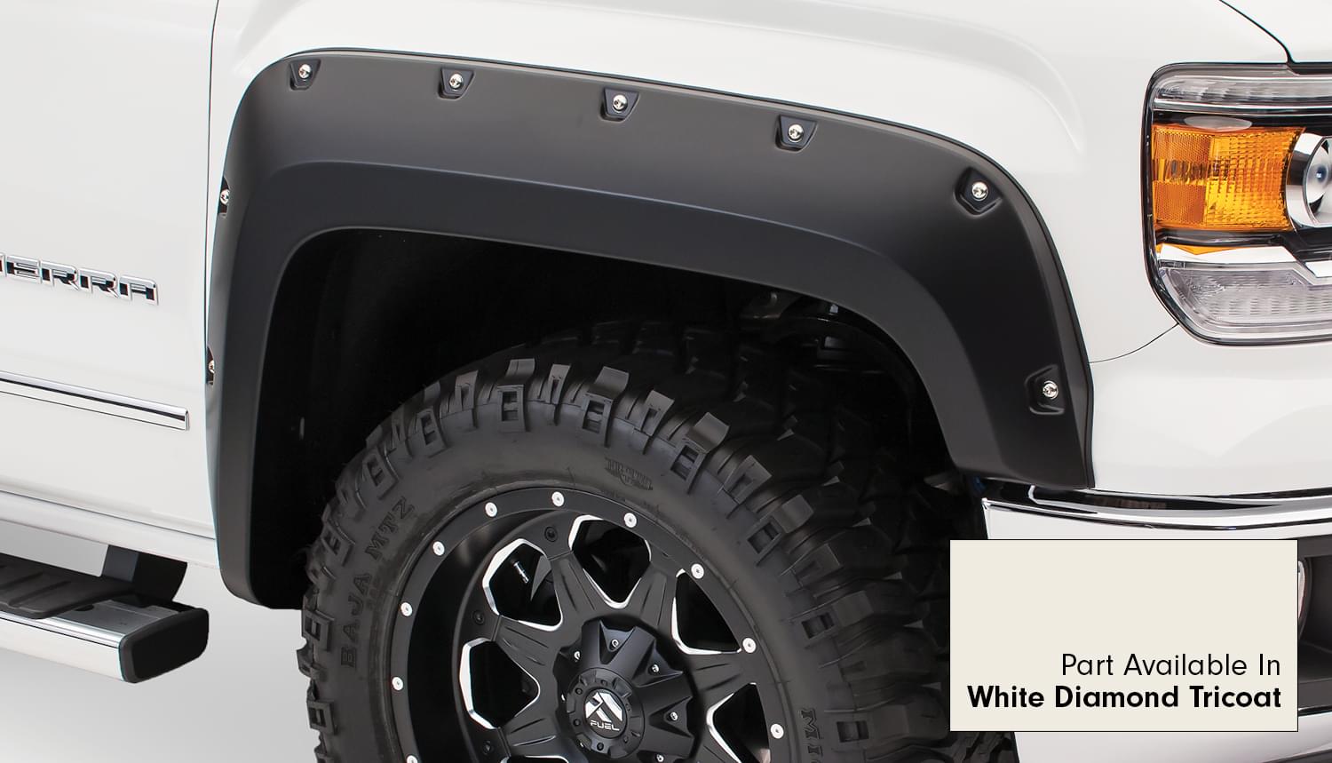 Set of 4 GMC Pocket Style Flares for the 14-15 GMC Sierra 1500 69.3 in., 78.8 in. and 97.8 in Bed Lengths. Note: Factory mudflap removal required for fitment.