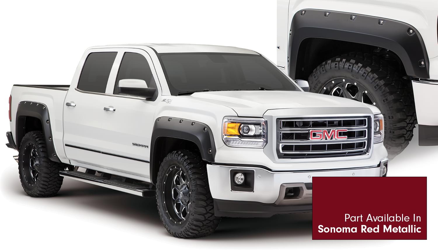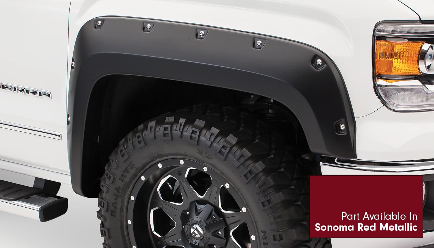 Set of 4 GMC Pocket Style Flares for the 14-15 GMC Sierra 1500 69.3 in., 78.8 in. and 97.8 in Bed Lengths. Note: Factory mudflap removal required for fitment.