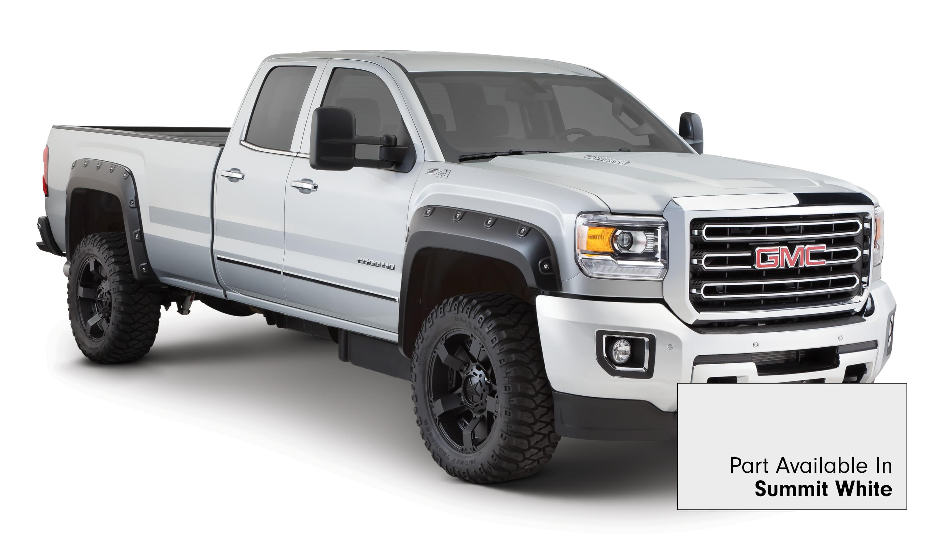 Set of 4 GMC Boss Pocket Style Fender Flares for the 15-16 Sierra 2500/3500 HD 78.8 in bed and 97.6 in bed. Note: Factory mudflap removal required. Does not fit dually models.