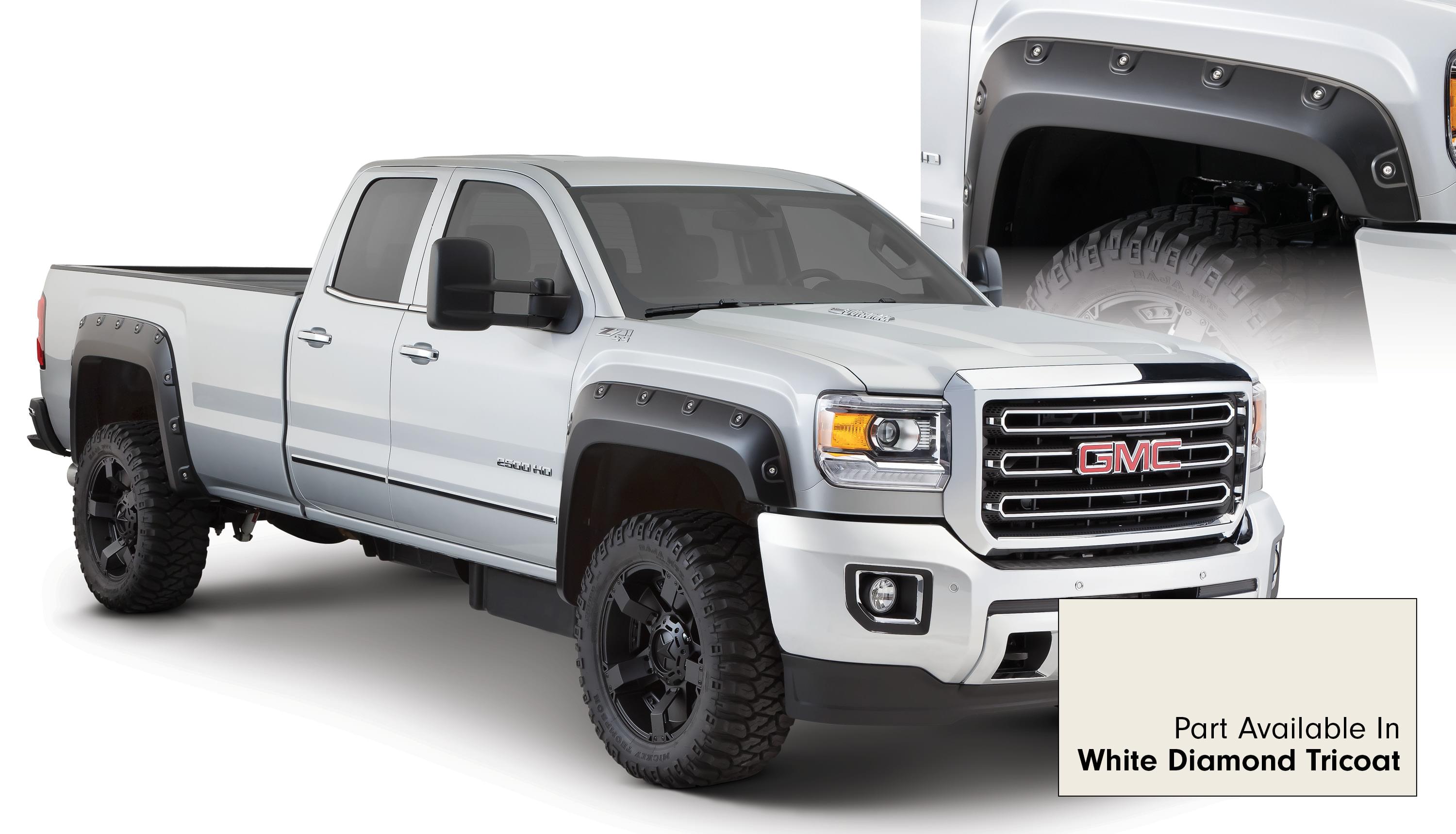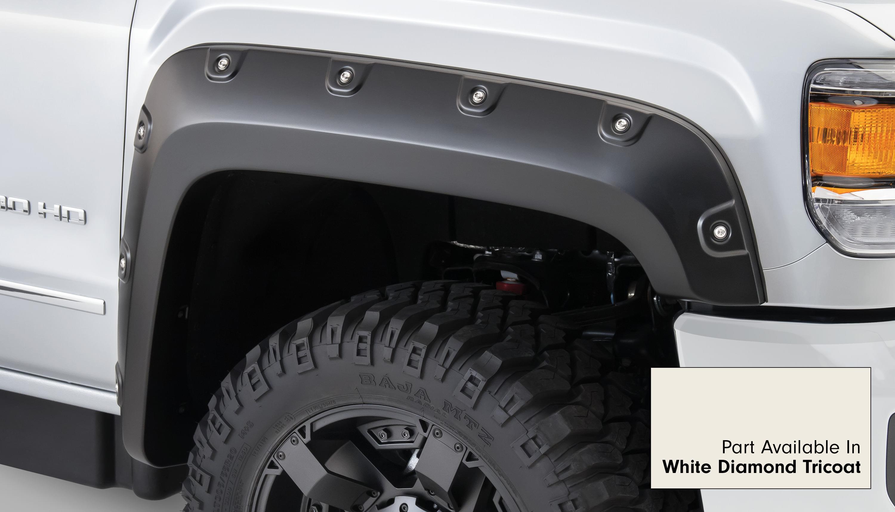 Set of 4 GMC Boss Pocket Style Fender Flares for the 15-16 Sierra 2500/3500 HD 78.8 in bed and 97.6 in bed. Note: Factory mudflap removal required. Does not fit dually models.