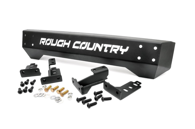 Want the benefits of a stubby bumper without running a winch? Now you can upgrade your look and performance at a fraction of the cost. Rough Country`s TJ Bumper Skin attaches easily to the frame horns with a bolt-on installation process. This lightweight bumper is less than 40-lbs, with a true stubby design allowing more travel, better approach angles, even the ability to run wider tires! With a high tensile steel design, this bumper offers protection and style, featuring a laser cut "Rough Country" logo that`s sure to turn heads on and off the road. Best of all, this affordable and sleek bumper can also house our popular line of bumper attachments. Upgrade your bumper with a set of D-rings (#1058), Light Bar (#1014), or for a fierce, sporty look, go all out with the Stinger attachment (#1013).