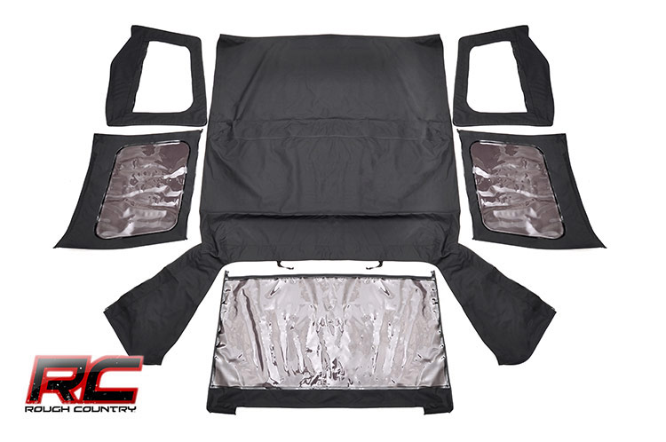 Whether you`re restoring, updating, or trying to give your Jeep the look you`ve always wanted, Rough Country?s new Soft Tops give you the absolute best bang for your buck. Featuring a 23-ounce UV and Mildew resistant Vinyl Coated Polyester Cotton material, our tops are engineered to hold up to the harshest elements.