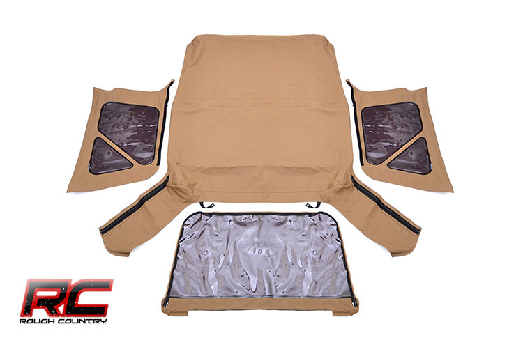 Whether you`re restoring, updating, or trying to give your Jeep the look you`ve always wanted, Rough Country?s new Soft Tops give you the absolute best bang for your buck. Featuring a 23-ounce UV and Mildew resistant Vinyl Coated Polyester Cotton material, our tops are engineered to hold up to the harshest elements.