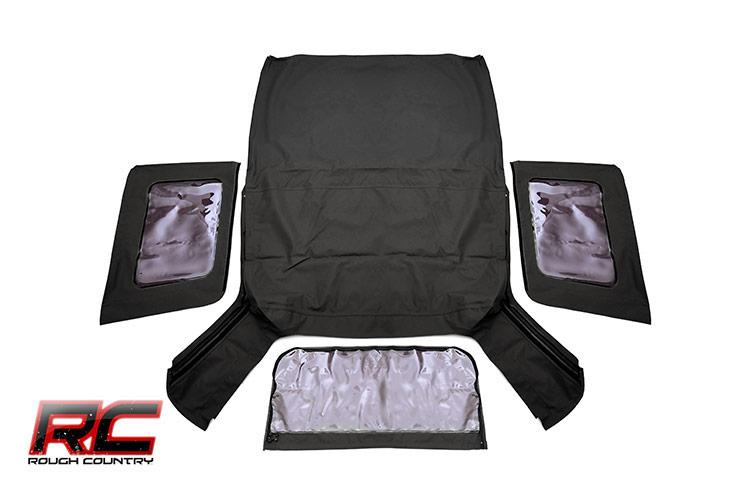 Whether you`re restoring, updating, or trying to give your Jeep the look you`ve always wanted, Rough Country?s new Soft Tops give you the absolute best bang for your buck. Featuring a 23-ounce UV and Mildew resistant Vinyl Coated Polyester Cotton material, our tops are engineered to hold up to the harshest elements.