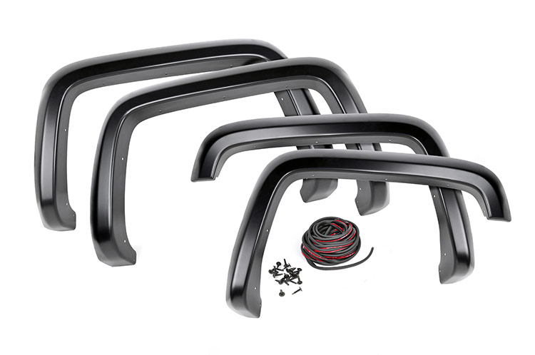 Add aggressive good looks, quickly and easily, with Rough Country`s Pocket Fender Flares. Nothing compliments a new lift, wheels, and tires like a set of stylish, mean-looking fender flares. These fender accessories quickly bolt on at a few secure mounting points, making installation a cinch. No cutting or drilling is required to install, and these flares can be easily removed and return your truck to stock! These UV treated fender flares ship in flat black, can easily be painted to match your vehicle, and are designed to withstand the sun, rain, and other elements of nature. Rough Country Fender Flares are guaranteed to be free of defects for 3 years!